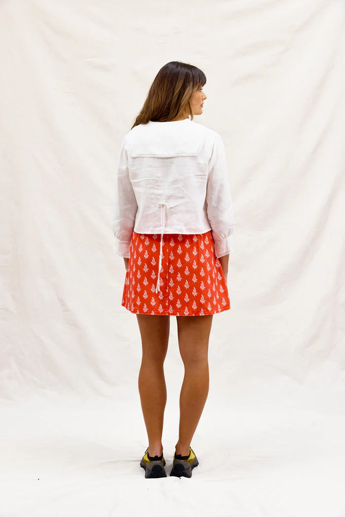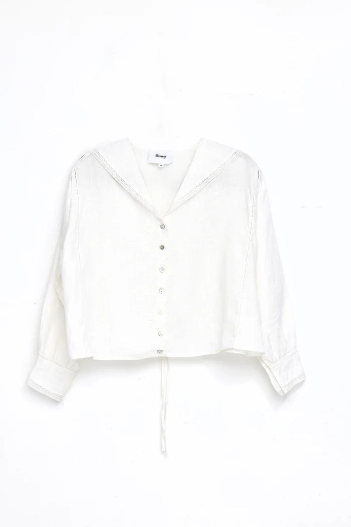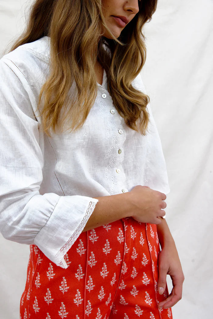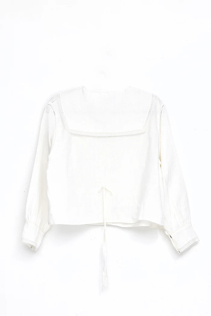 Snowflakes that stay on my nose and eyelashes. Silver-white winters that melt into springs. White lace trimmed shirts are right up there with a few of our favorite things. Snowflakes is a seriously adorable linen shirt trimmed with lace, mother of pearl buttons & sweet contrast lapels. Balancing softness and structure. Inspired by frost on windows and quiet mornings inside. Light, breathable and beautifully old-fashioned. Side ties to cinch if you wish.