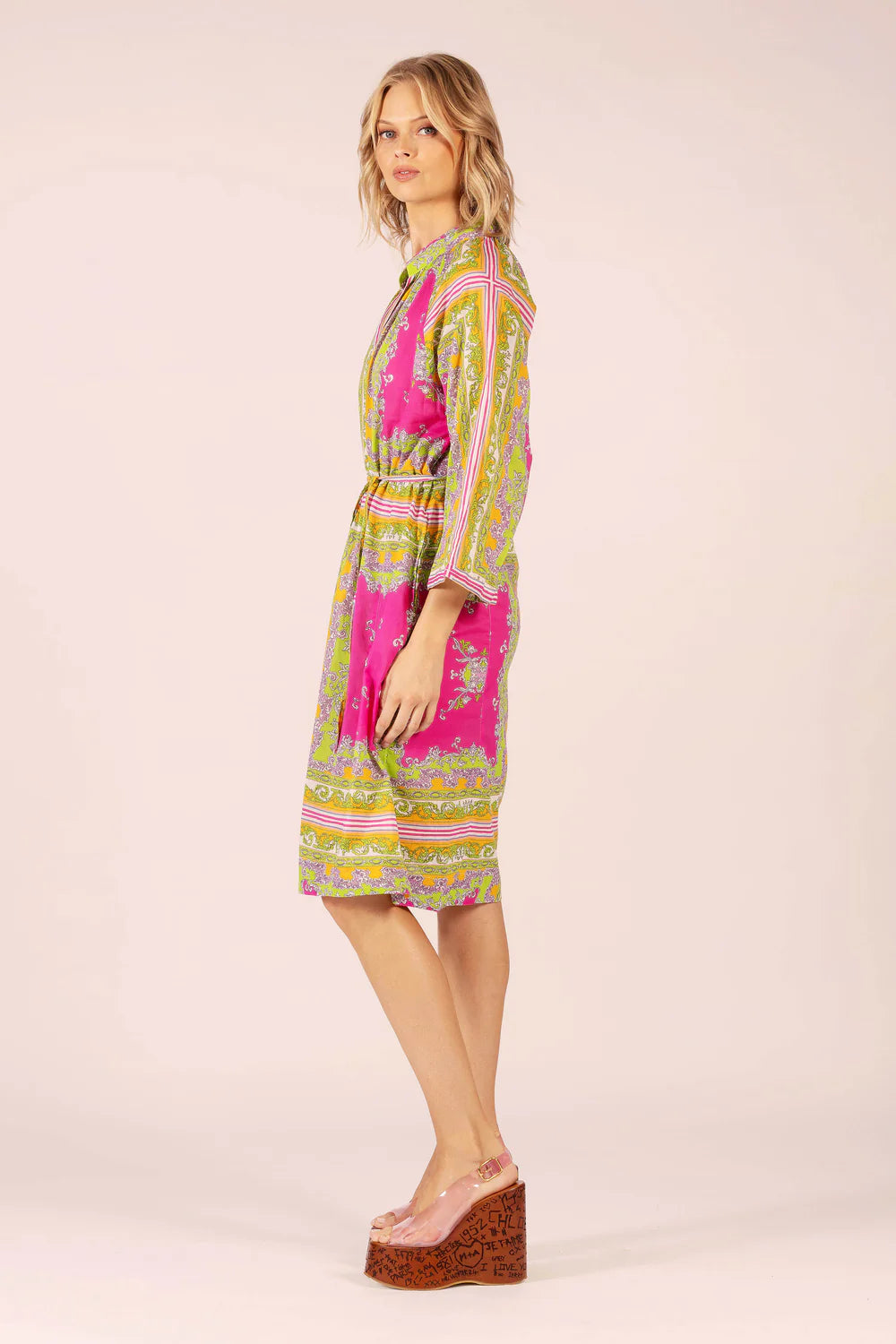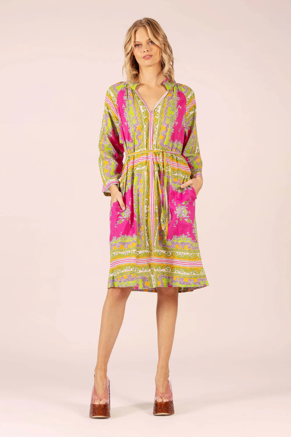 Enhance your collection with the Allegra Midi Dress in the vibrant Aria print. Crafted from lightweight, breathable cotton, this mid-length dress offers a graceful drape and effortless comfort. Featuring flowing kaftan sleeves, an integrated wrap belt, and a V-neckline, it sculpts a refined and flattering silhouette. Perfect for both casual outings and semi-formal moments, its versatile design lets you wear it loose for ease or tied at the waist for a polished finish.