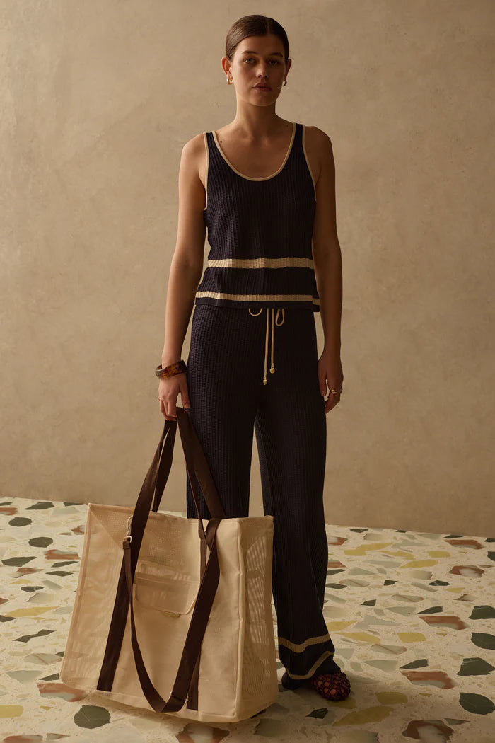 A perfect wardrobe staple and layering piece. The Cali Knit Top is a slim fit, so it’s easy to tuck in or layer. It features a minimal crew neckline with a statement stripe running across the body. Perfectly paired with jeans or matching knit pants, standing alone or with layers over the top.