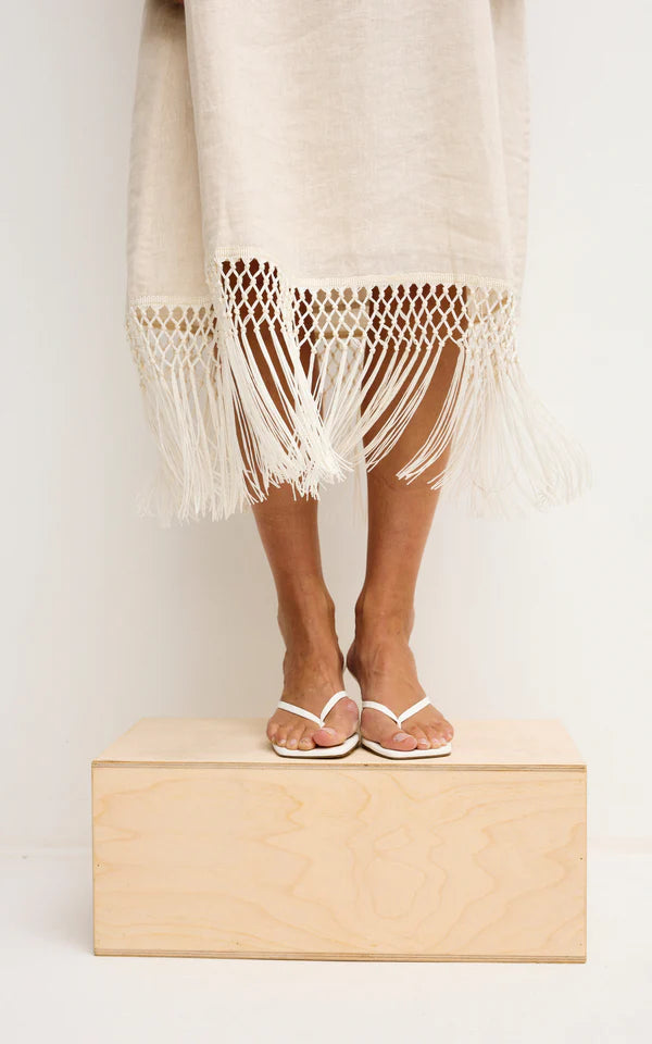 Crafted from a breathable, linen fabric, this sleeveless midi dress features a relaxed silhouette that drapes beautifully on the body. The minimalist design is elevated with a beautiful macramé look fringed hem, adding a touch of charm and movement to each step.