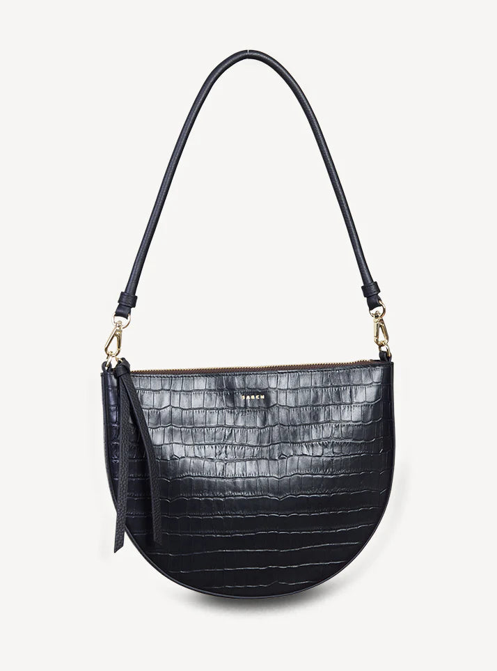 The classic shoulder bag reimagined in rich croc embossed leather. Gani's softly curved shape showcases the textured croc finish beautifully, moving seamlessly from day to evening. The detachable rolled shoulder handle offers versatile styling, while the gold box chain zip pull adds a refined edge. Bold, elegant, and wrapped in luxurious croc texture — Gani is your new statement essential.