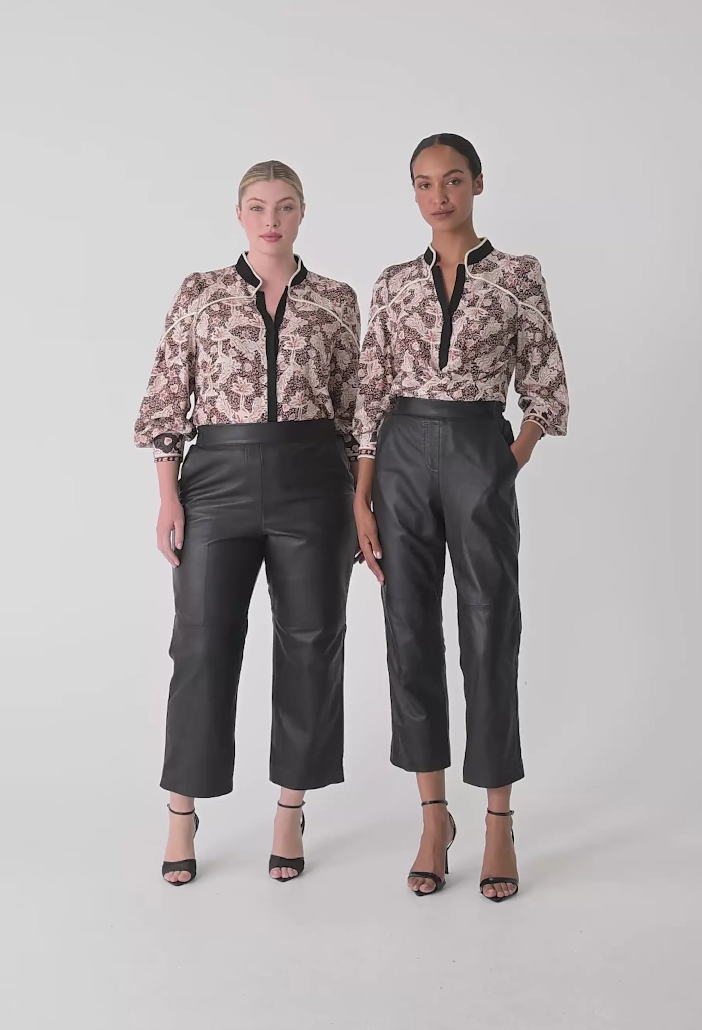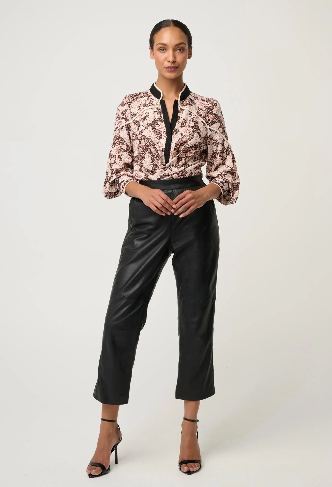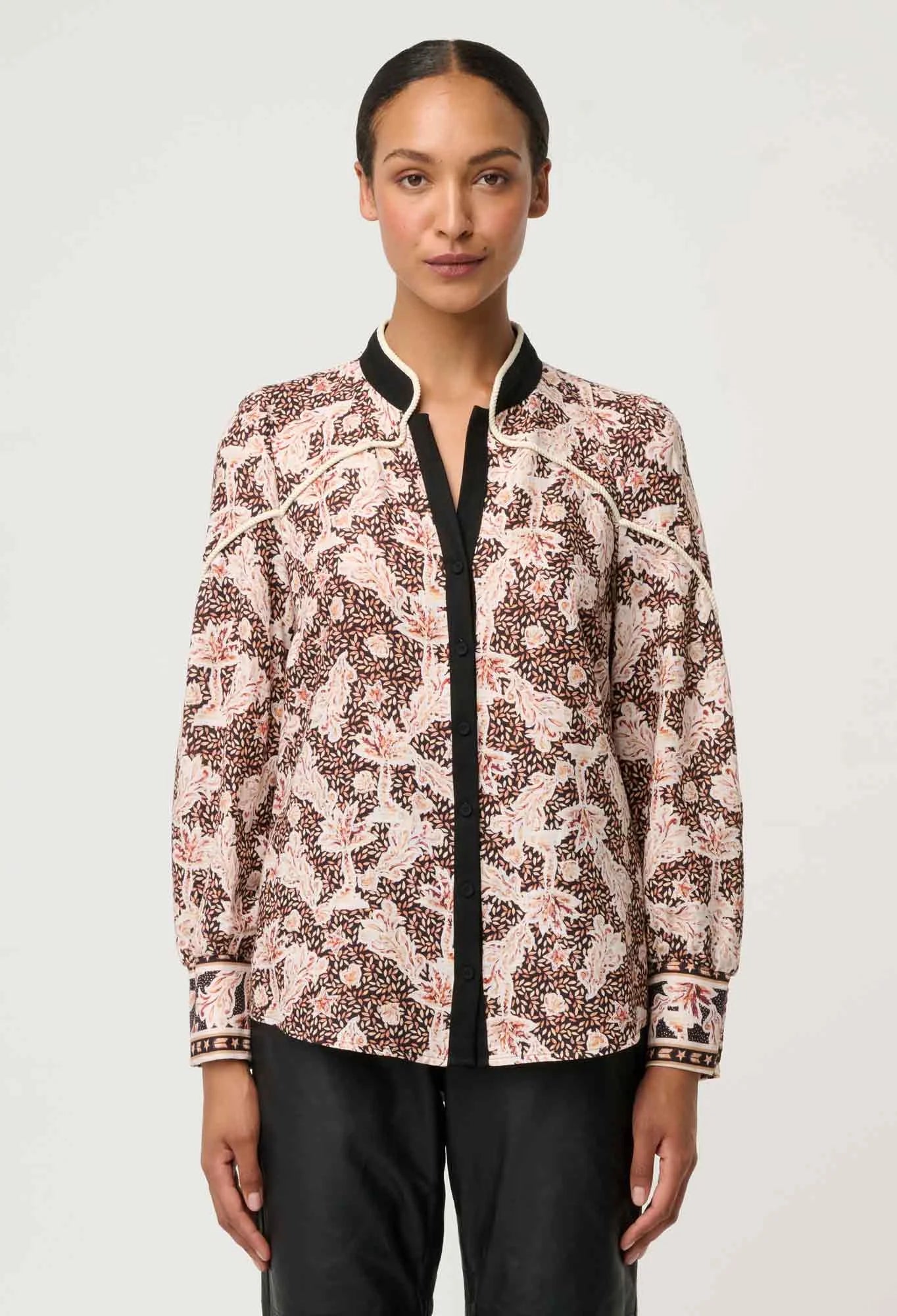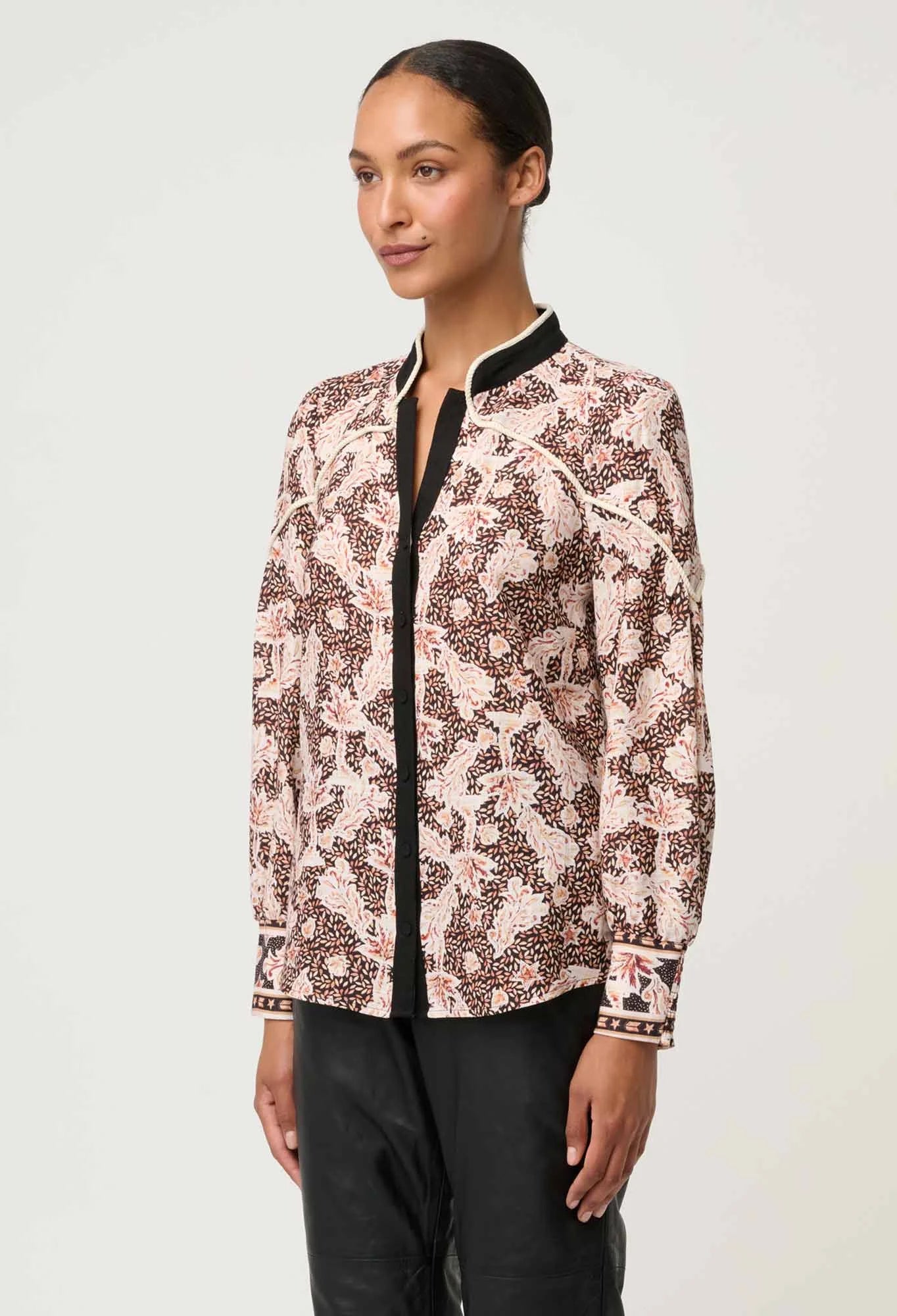 The russet palm print brings a sophisticated, earthy tone to a classic silhouette, while the contrast rope trim detailing and sleek mandarin-style collar add a tailored finish. A subtle split neckline enhances versatility, allowing the shirt to be worn open for a relaxed look or styled neatly for a more polished feel. Lightly bloused sleeves and a flattering, easy fit make it effortless to pair with leather trousers, tailored pants, or denim.