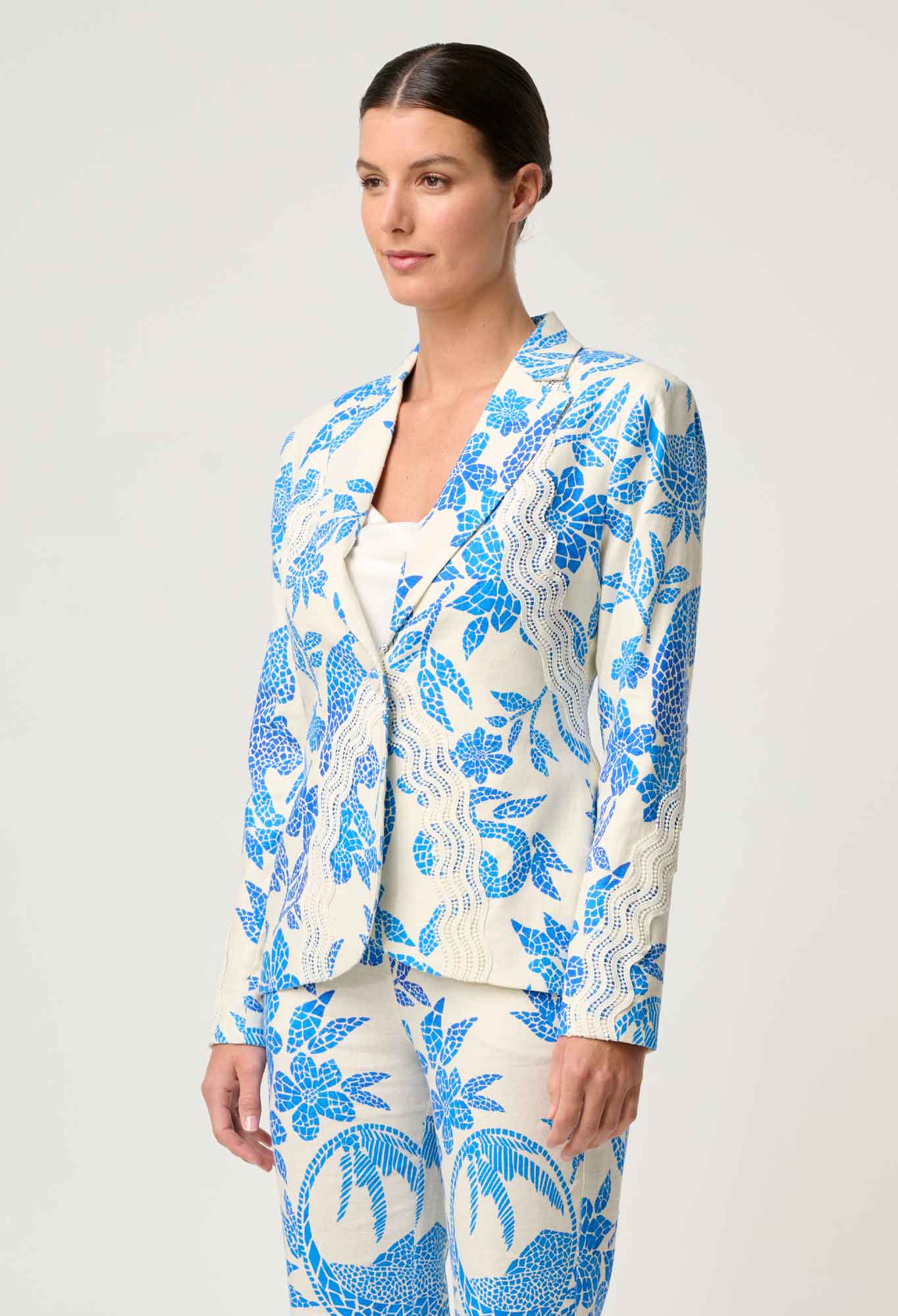 Exude effortless power and poetic elegance in the Leandro Contrast Lace Linen Viscose Stretch Blazer in Azure Mosaic - a statement-making tailored piece that blends structured sophistication with feminine detailing. Expertly crafted from a luxurious linen-viscose stretch fabrication, this fitted blazer delivers breathable comfort, ease of movement, and a perfectly contoured silhouette.