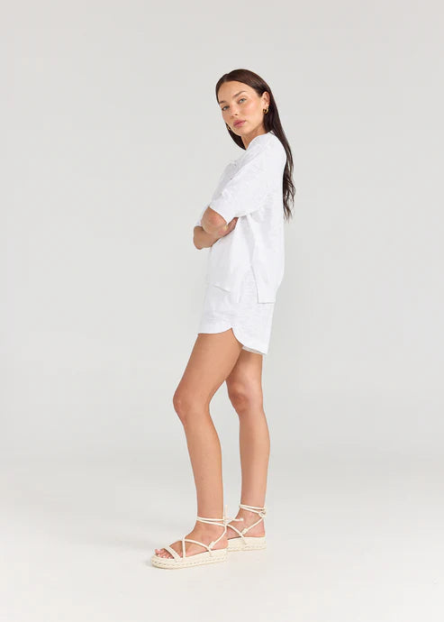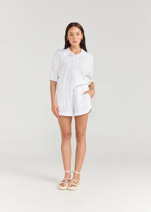 A favourite new classic shape in Linen Jersey. The polo top. A perfectly tailored collard top to dress you up from your basic T-shirts. Featuring a side split and front buttons, it's the perfect addition to your Summer wardrobe.