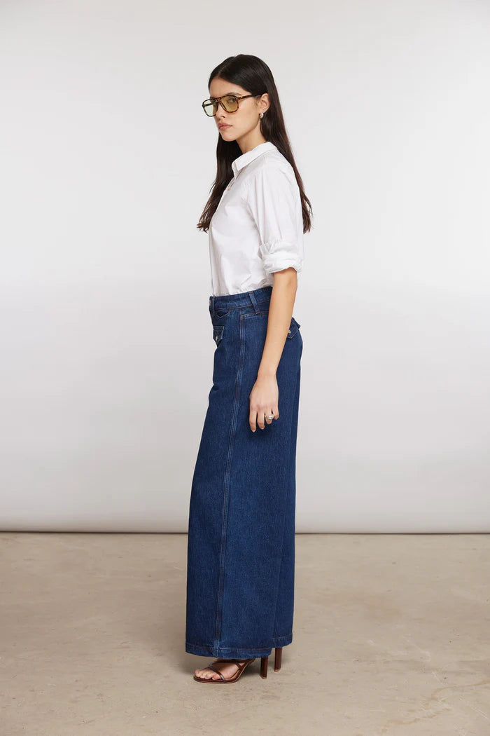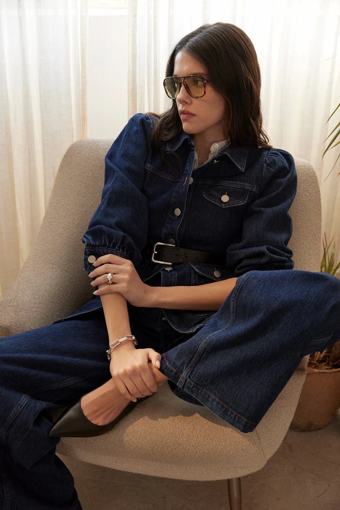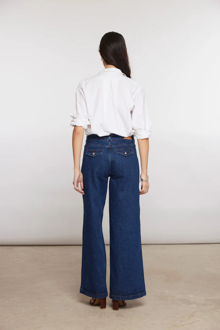 The newest must have wide leg jean with retro pockets and pairs seamlessly with the Demi jacket for the power-denim suit of the season.