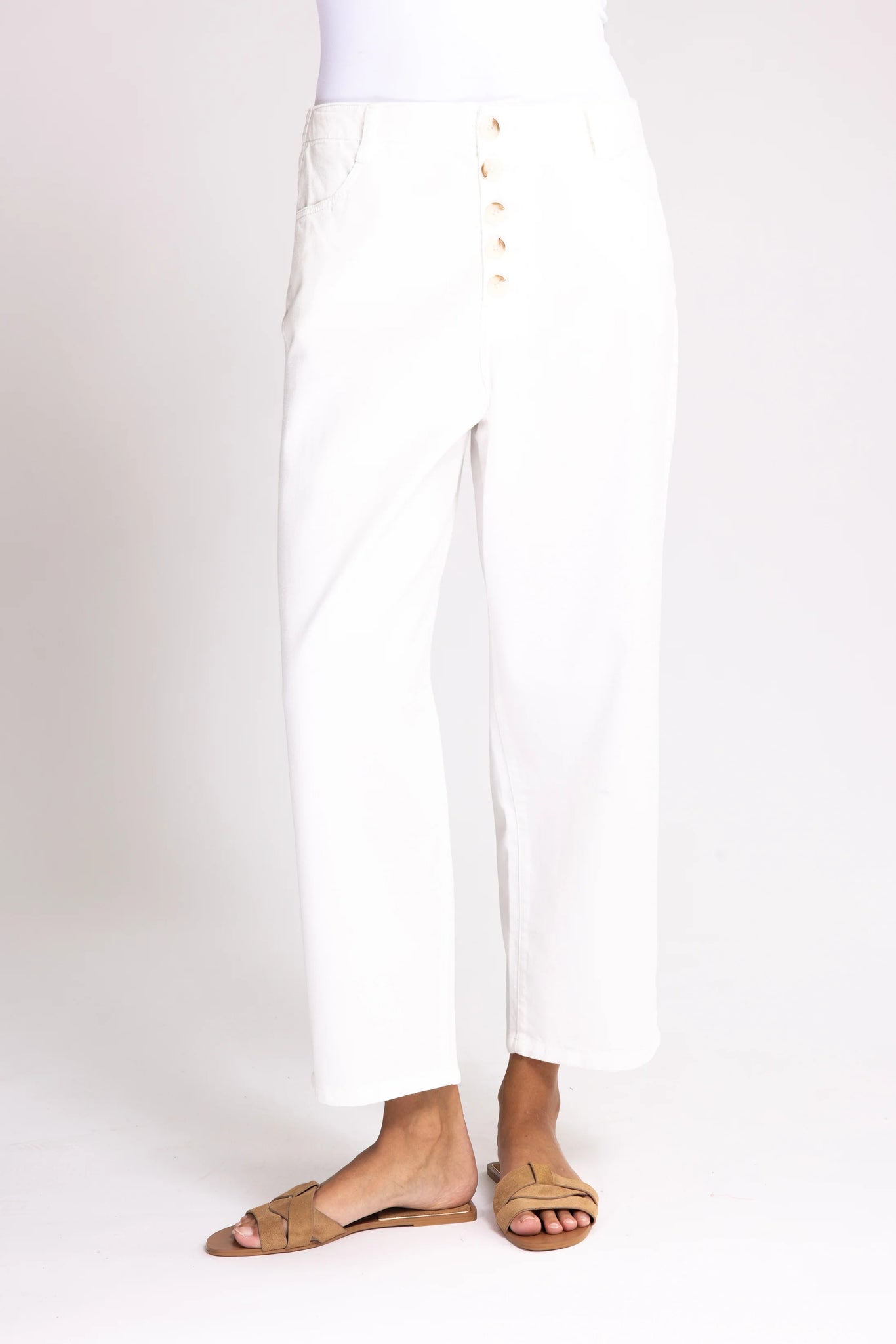 A fresh take on denim with the Sassi Barrel Jeans in a milky white. These mid-rise beauties feature a fun funky button fly and a modern barrel leg silhouette that's equal parts trendy and wearable. Crafted from lightweight cotton, they're perfect for year-round styling without the bulk. The 7/8 length hits just right for showcasing your favourite kicks or sandals. Effortlessly cool, endlessly versatile.