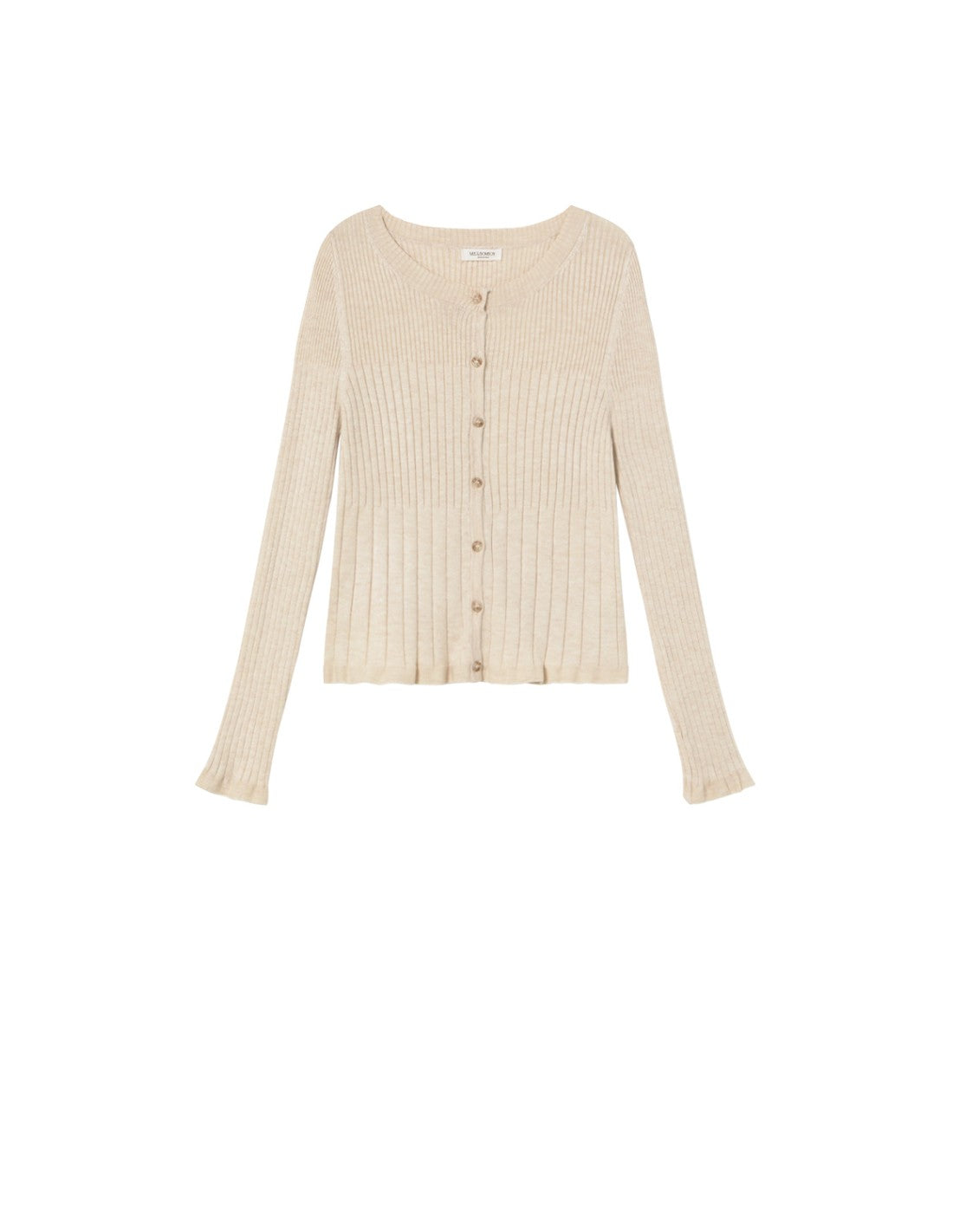 Long-sleeved, straight-cut cardigan with an unique design combining three different types of ribbing on the body and two on the sleeves. It has a round neck and a front button placket. The cuffs feature a three-button detail. It pairs perfectly with the Seef top for a two-piece design.