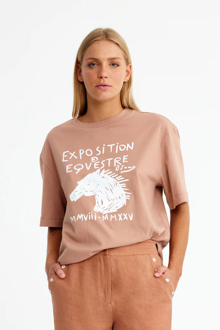 Exposition Equestre - referring to a public display of horses & horsemanship. This 100% cotton jersey tee channels mocha brown chic French gallery coffee & croissants. The bound neckline & curved hem keep the fit polished while you half, French, full tuck. Equally at home with tailored tonal trousers or worn-in denim. The hardest working item in your wardrobe. Begone boring plain white tee & add some character to your lewk. Crisp perfect weight 100% cotton jersey. Bound neckline & cuffed sleeves that keep the silhouette sharp, but perfectly oversized. Curved hem lends an easy, flattering drape to your half, french or full tuck. Giddy Up. Pair it with our excellent JODPHUR pant. Understated, versatile, rising trot into flying changes.