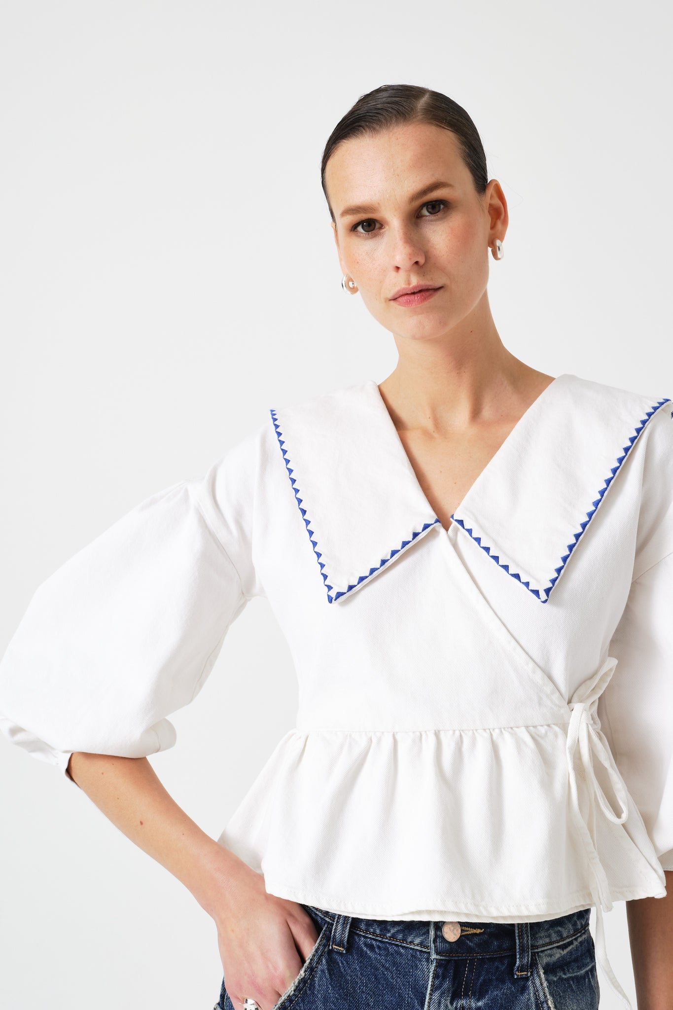 The Nour Blouse is a playful wrap blouse designed to elevate your denim. The beautiful sailors collar adds detail to the neckline, while the wrap peplum bodice finishes at a cropped length, perfect for wearing with your favourite high waisted jeans or skirts.